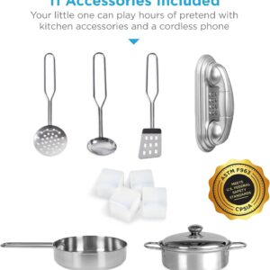 - 11 ACCESSORIES INCLUDED: Set includes 3 utensils, 2 pots, 1 lid and kitchen comes with an ice maker that dispenses 4 ice cubes, and cordless phone; keep the accessories in the overhead shelf, the oven, in the fridge, freezer, microwave, or dishwasher