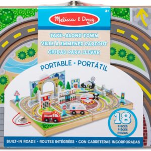 Melissa & Doug 18-Piece Wooden Take-Along Tabletop Town, 4 Rescue Vehicles, Play Pieces, Bridge